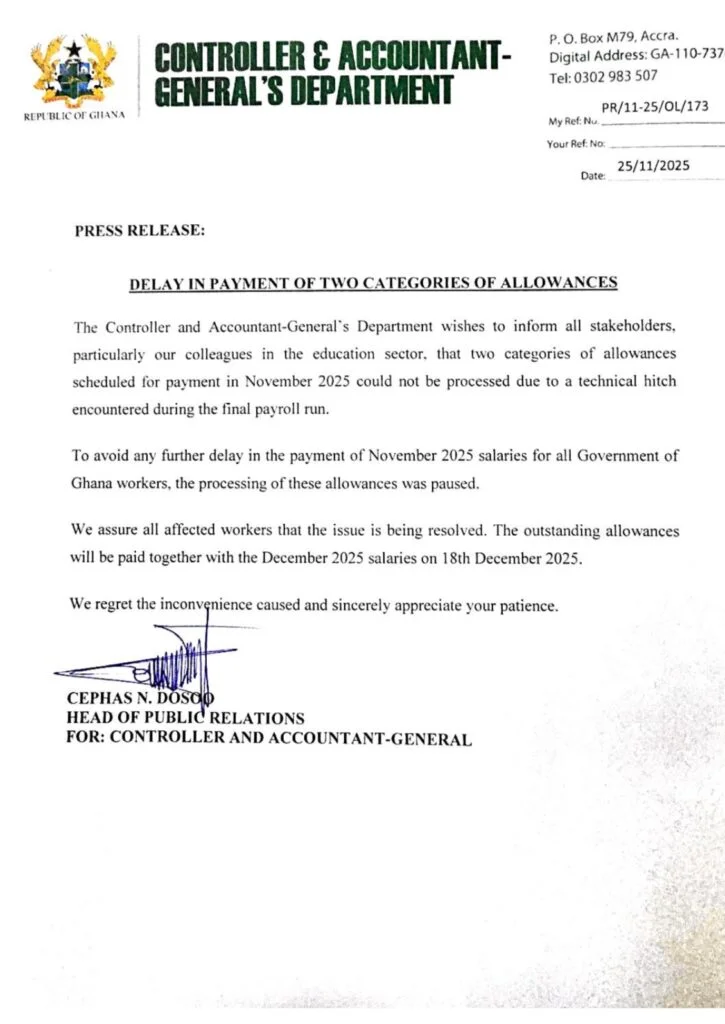The Controller and Accountant-General’s Department (CAGD) has temporarily suspended two categories of allowances for certain government employees, particularly those in the education sector, following a technical fault that affected the final November payroll run.
