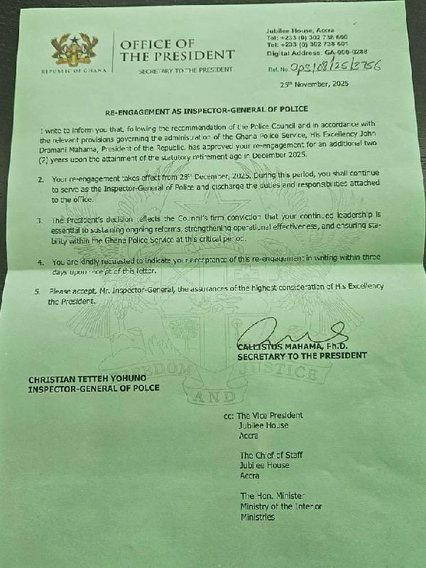President John Dramani Mahama has approved a two-year extension for Inspector-General of Police (IGP) Christian Tetteh Yohunu, following a recommendation from the Police Council. The extension, effective from 28th December 2025, allows the IGP to continue serving beyond the statutory retirement age.
